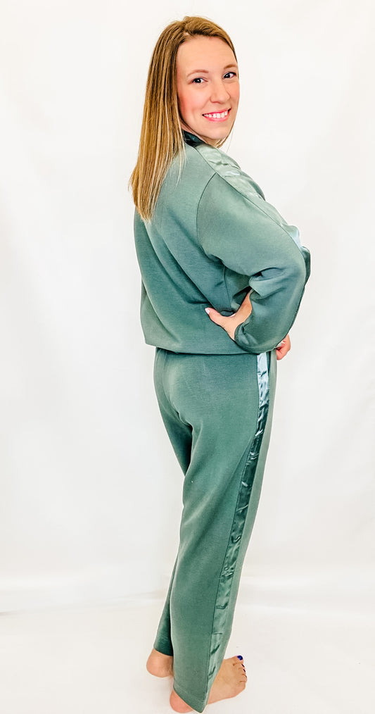 Sage Leaf Scuba Knit Pants with Side Satin Detailing