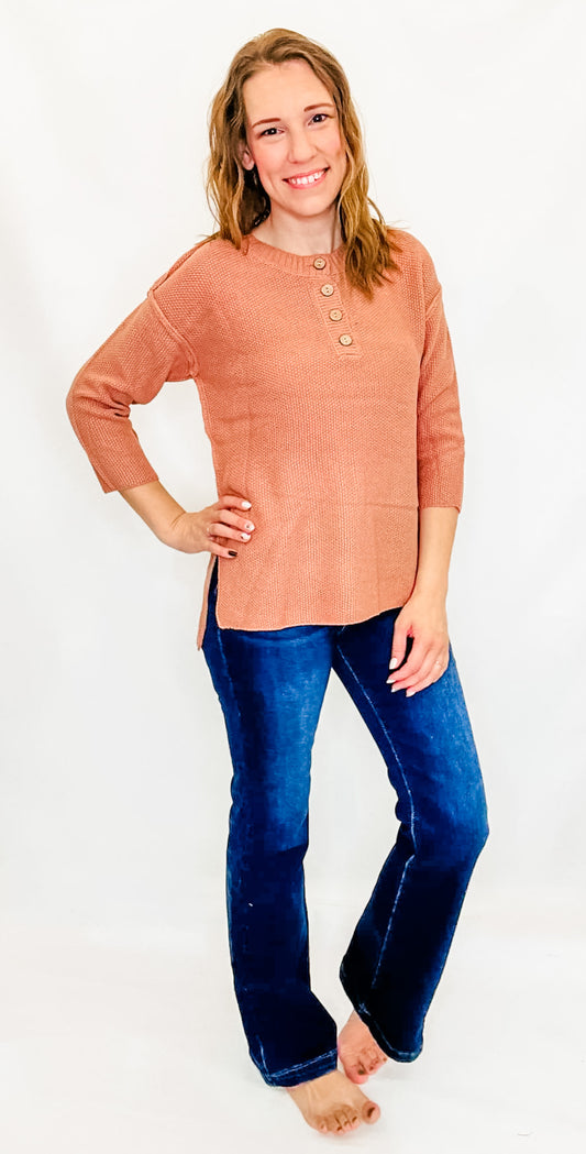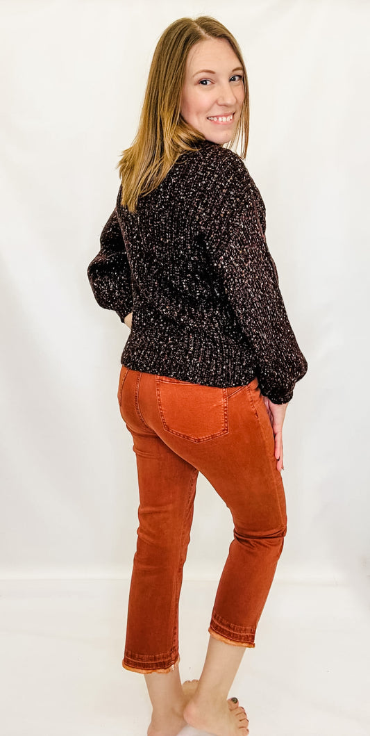 Charlie B Terracotta Rust Bell Bottom Pants with Frayed Asymmetrical Hem