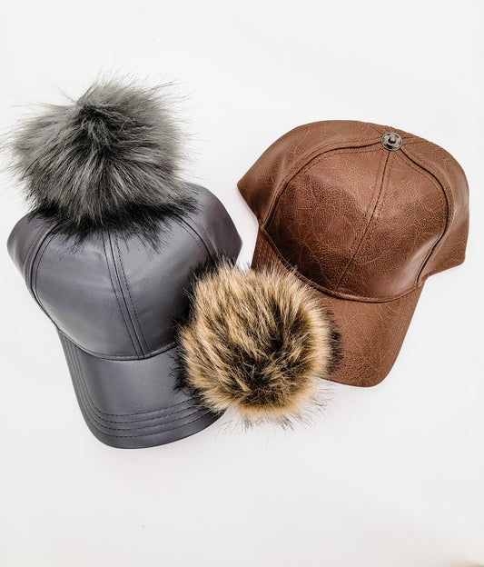 C.C. Faux Leather Fur Pom Ball Cap - Variety