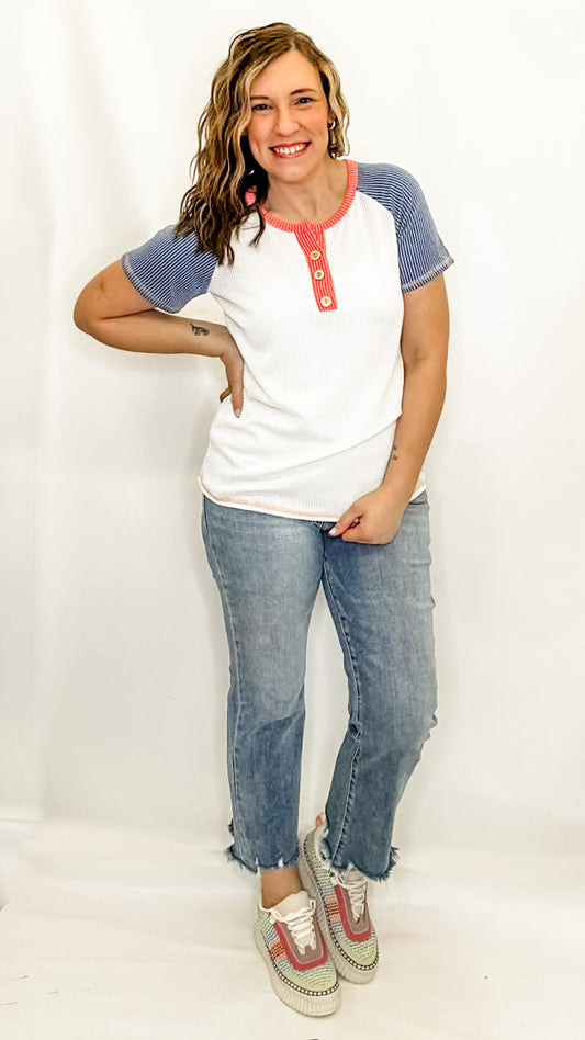 7th Ray - Rib Patchwork Button Front Raglan Short Sleeve Top T5942