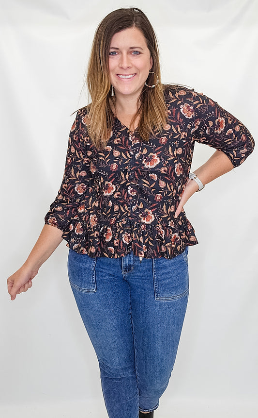 Keren Hart Black Knit Fall Floral Peplum Blouse