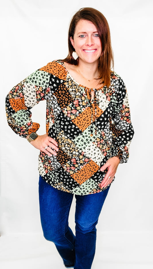 Black & Olive Boho Floral Patchwork Long Sleeve