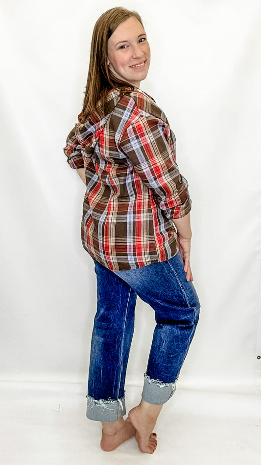 Sold outBrown, Red & Blue Plaid Hooded Shirt