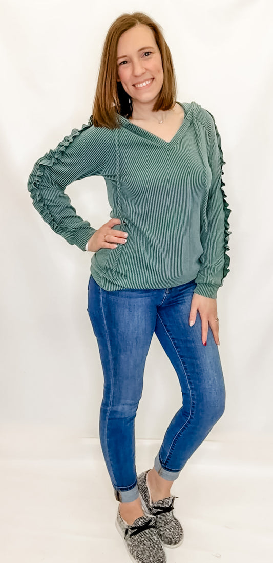 Vintage Olive Ribbed Casual Hoodie with Ruffle Sleeves