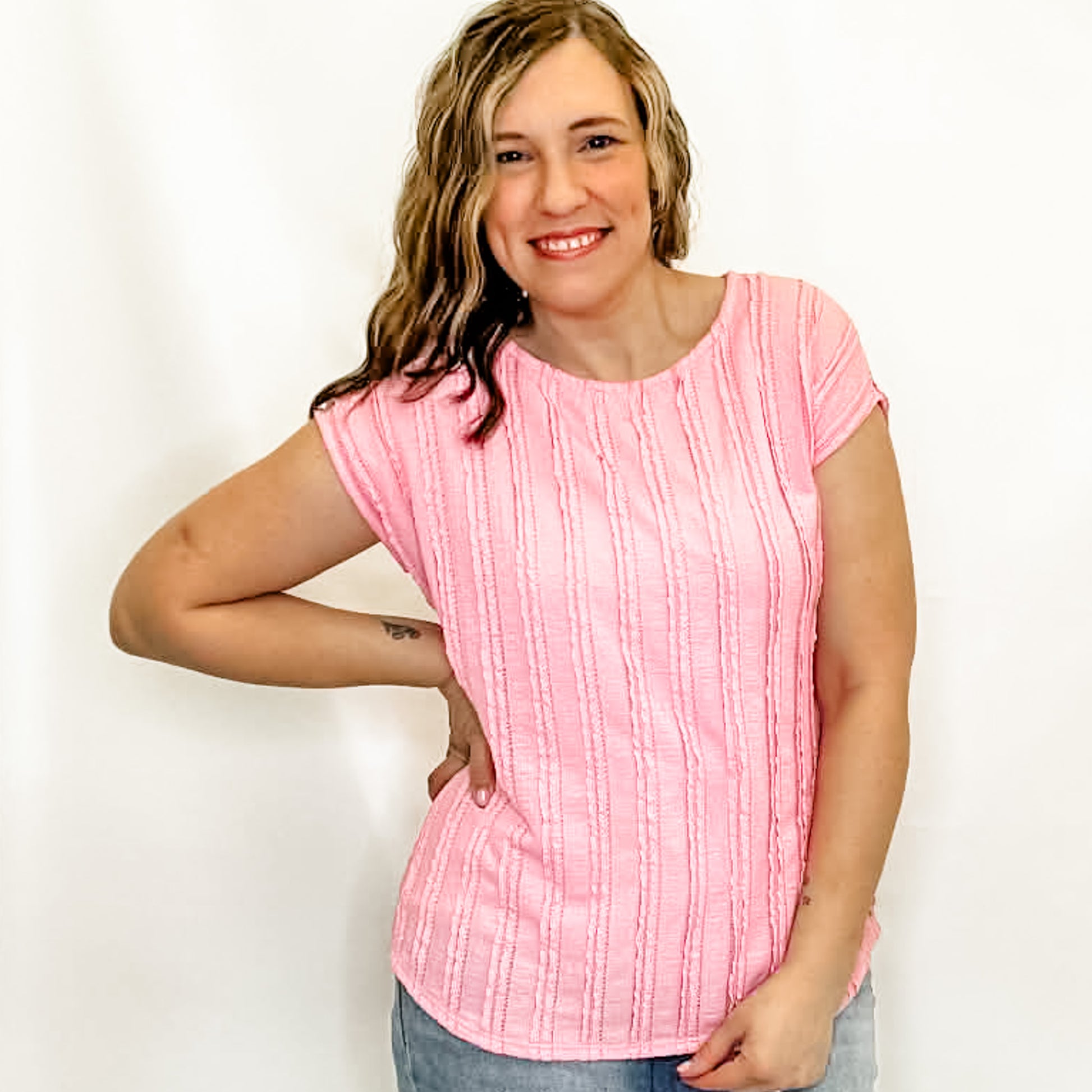 Feel pretty in pink with this Pink lightweight textured blouse with cap sleeves! Great with denim shorts this spring and summer!
