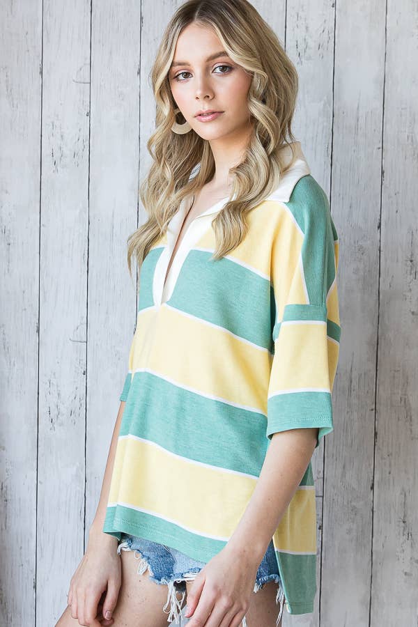 Grab this Oversized Stripe Top Featuring a Collar Split neckline, drop shoulders, solid contrast, split sides, hi low detail, and short Sleeves. Pretty casual - cute with shorts and sandals!
