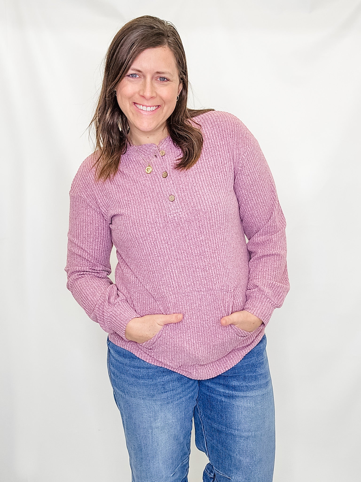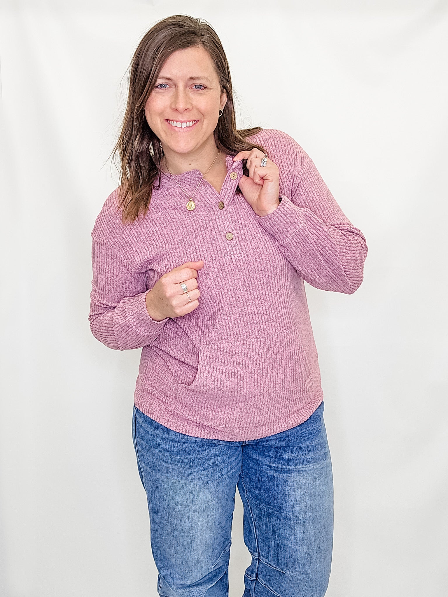 A beautiful purple pink henley that gives casual mom vibes while still making you look so put together! Dress up or dress down. Wear alone or layer!