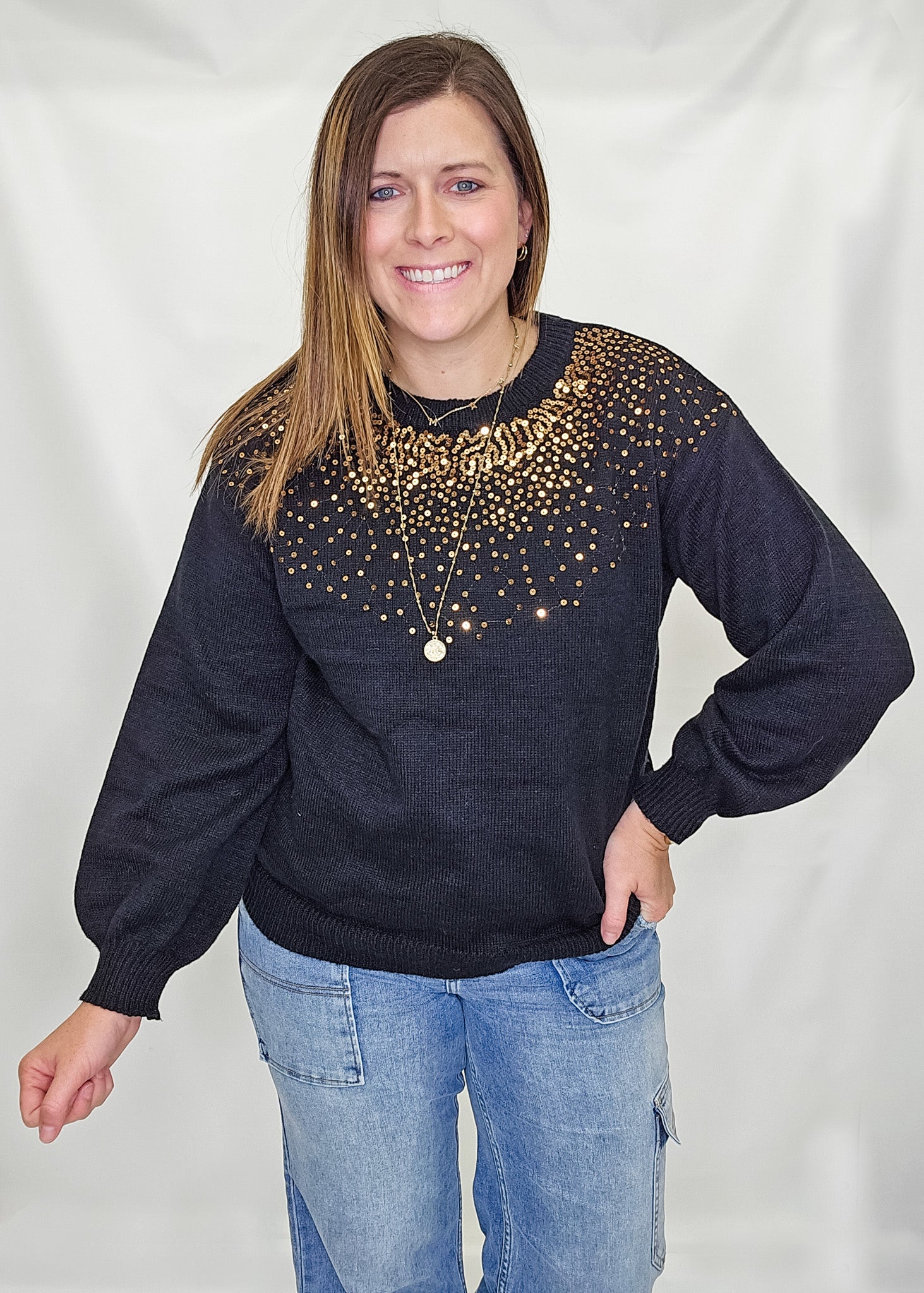An adorable black sweater for the holidays that will allow you to sparkle without being too much! Love this with jeans for a casual look or a skirt do dress it up!