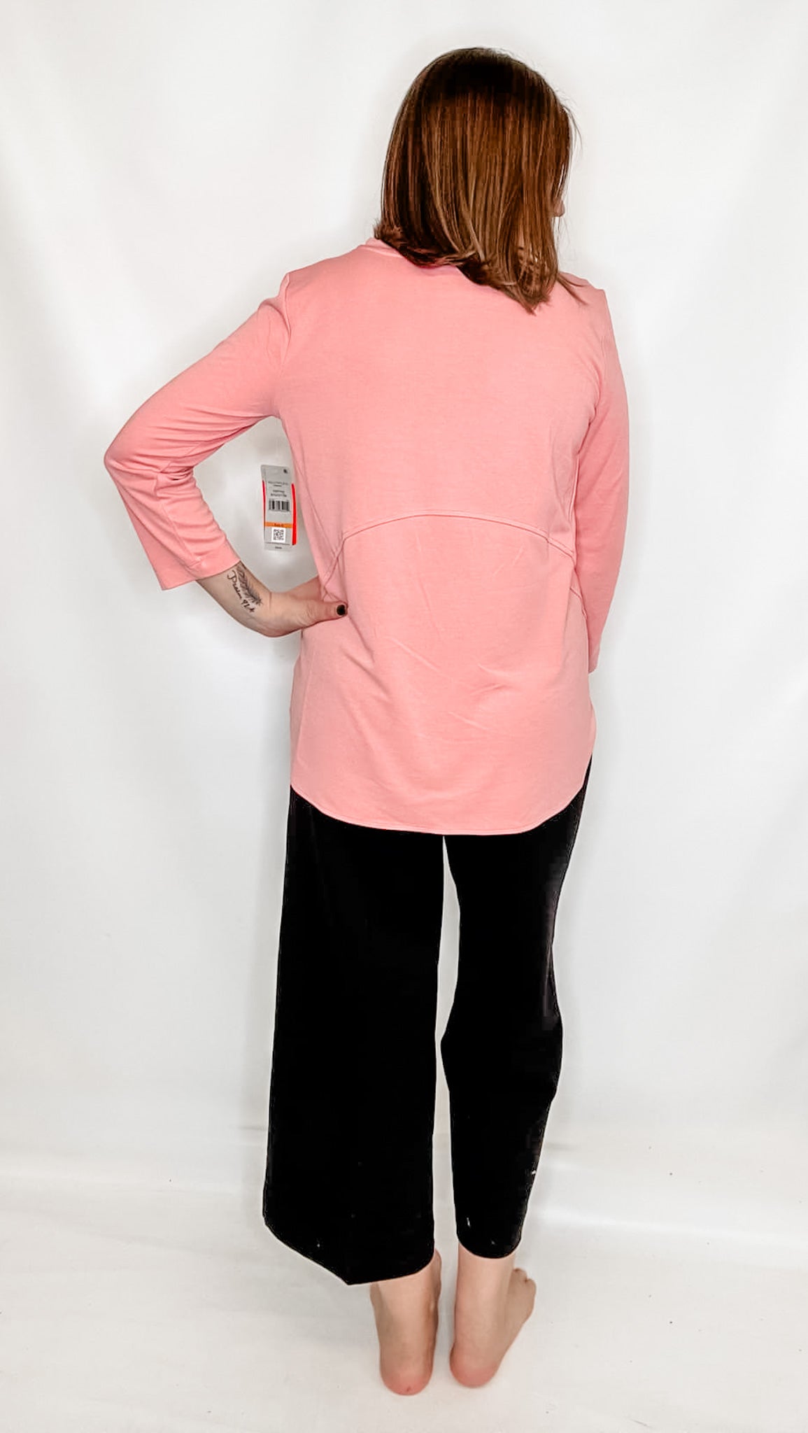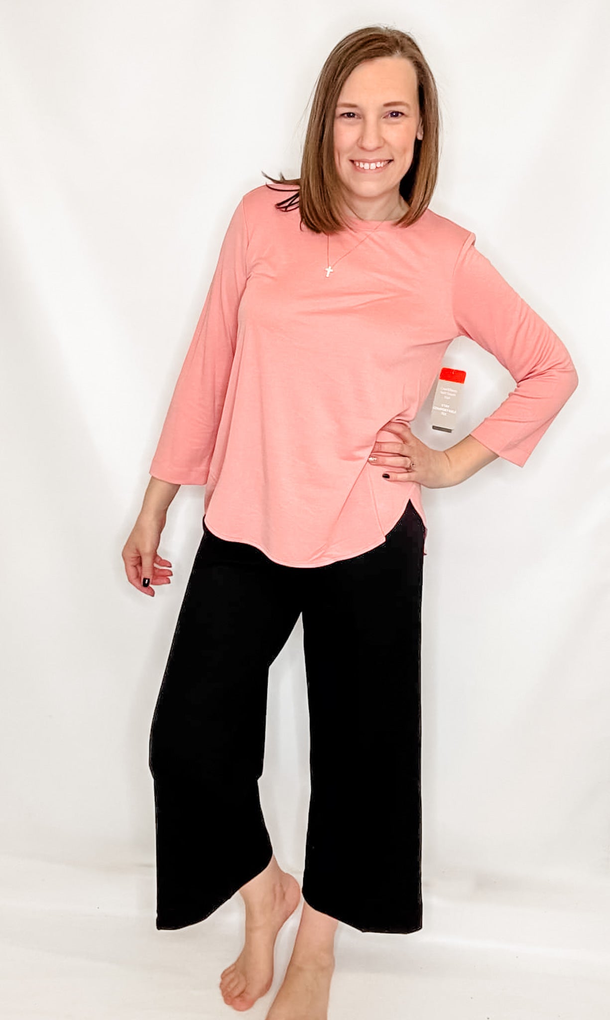 Grab this gorgeous blush 3/4 sleeve top to wear alone or layer it under a vest or jacket! A beautiful color for spring and summer!