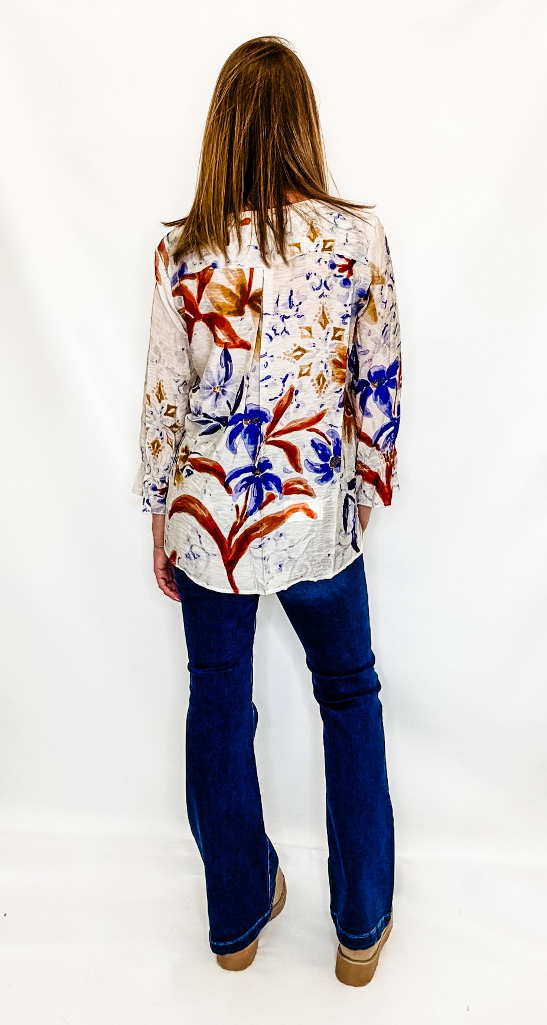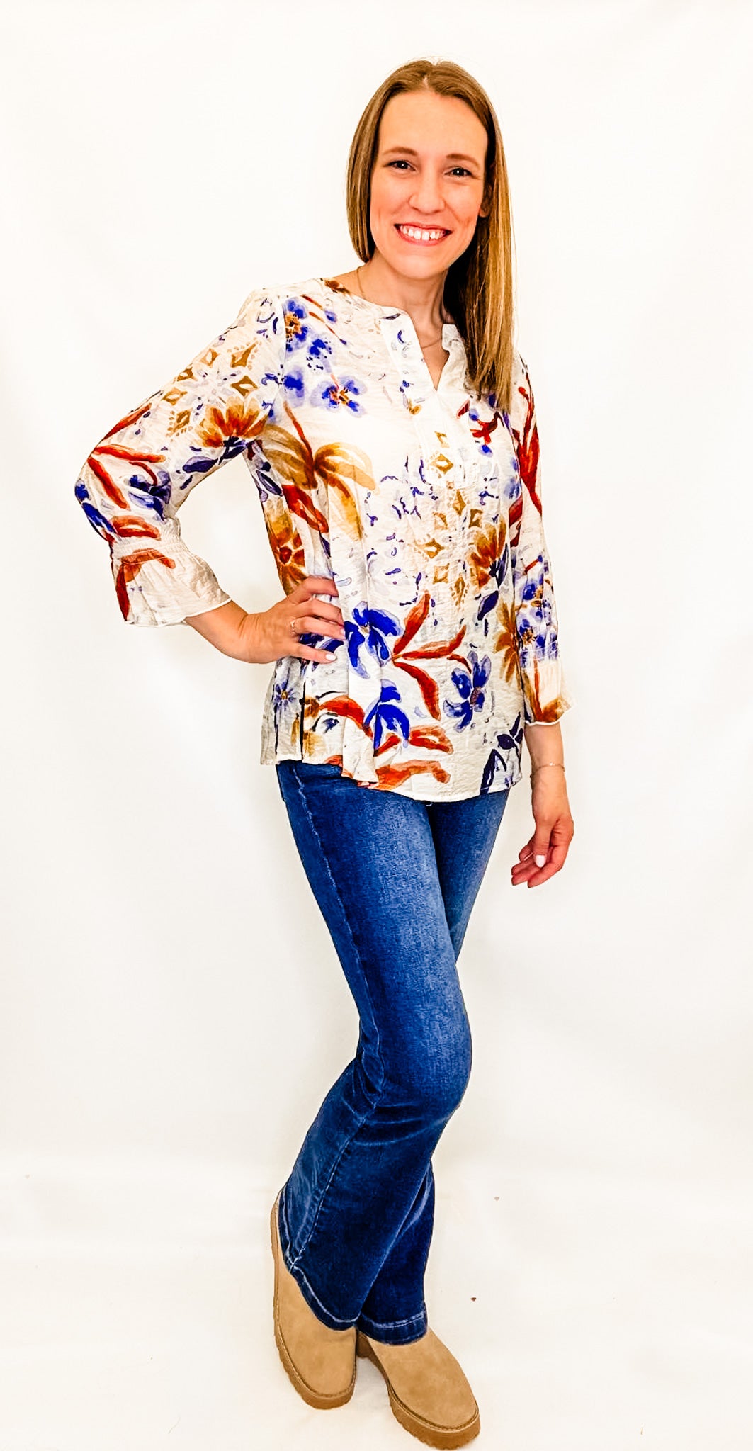 We love these transitional Fall colors as we start to look towards cooler temps! Pair this top with the Ivory Slim-sation pants or blue jeans!