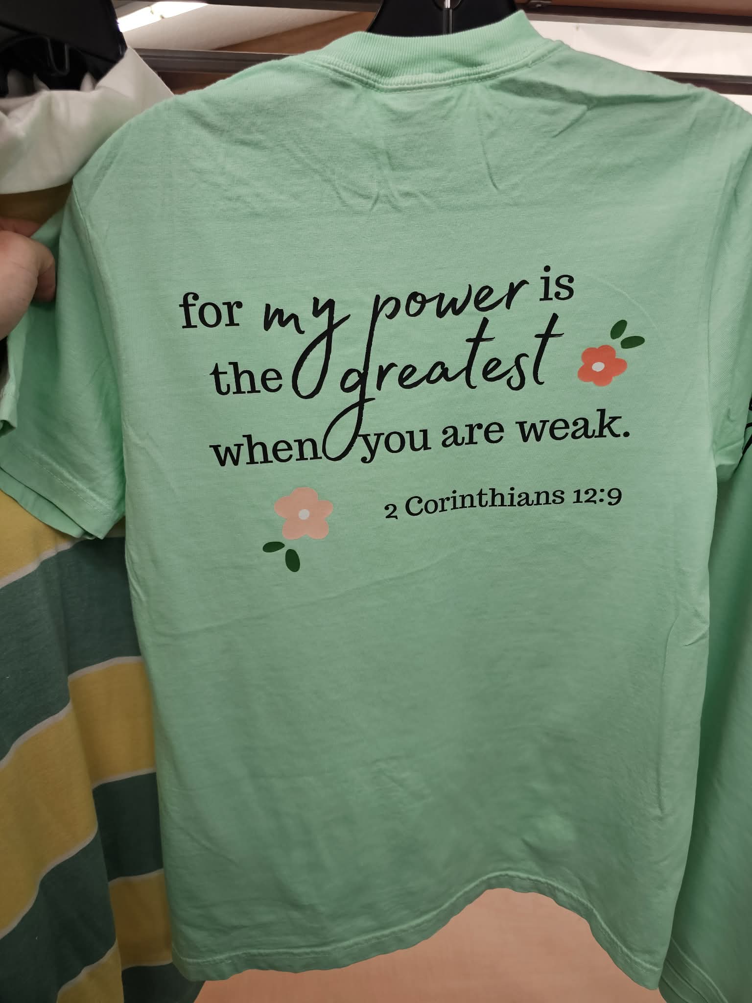 - Back: "For my power is the greatest when you are weak. 2 Corinthians 12:9"